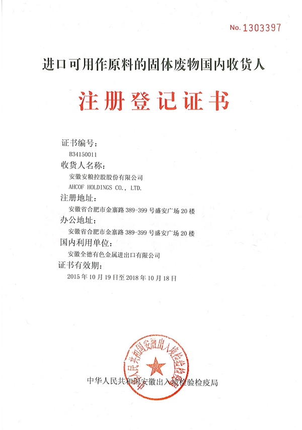 10月19日,安徽省出入境檢驗檢疫局向公司正式核發(fā)《進口可用作原料的固體廢物國內(nèi)收貨人》注冊登記證書。