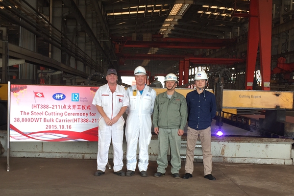 10月16日,安糧國(guó)際與江蘇韓通船舶重工有限公司聯(lián)合建造的38800噸雙殼散貨船開工儀式在韓通船廠舉行,德國(guó)船東PD駐廠代表、勞氏船級(jí)社驗(yàn)船師等共同參加了開工儀式。