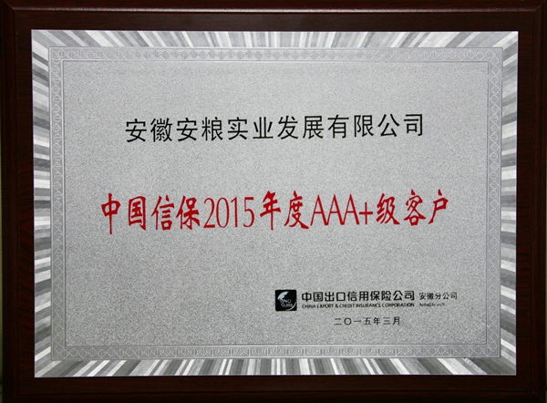 安糧實業(yè)成為中國出口信用保險公司在安徽地區(qū)近900家企業(yè)客戶中第六家獲此殊榮的企業(yè)?!爸袊隹谛庞帽kU公司2015年度AAA+級客戶”是中國出口信用保險總公司授予企業(yè)客戶的最高級別評價,對于獲得AAA+級評價的單位,中信保公司將特別開通綠色通道,給予限額上浮、優(yōu)先賠付、審核程序簡化、承保業(yè)務(wù)范圍擴大等系列鼓勵政策。