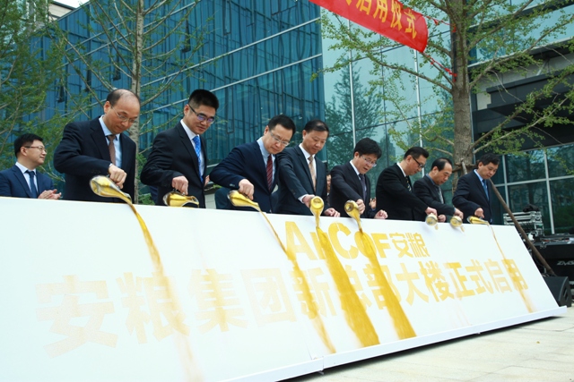 升旗儀式上,鮮艷的五星紅旗在莊嚴(yán)的國歌聲中緩緩升起,參加活動的全體人員向國旗行注目禮。啟用儀式上,曹訓(xùn)立董事長、方宗友總裁等集團領(lǐng)導(dǎo)在大家的熱烈掌聲和見證下,共同舉起金瓶將鎏金沙傾倒在啟用展板上,展板顯示出“安糧集團新總部大樓正式啟用”的字樣,活動進入高潮。隨后,全體人員在安糧中心總部大樓前合影留念,隨著快門定格時間的聲音響起,安糧集團新總部大樓升旗及啟用儀式圓滿禮成。