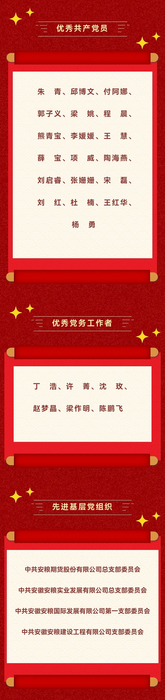 為大力弘揚黨的優(yōu)良傳統(tǒng)和作風,激勵各級黨組織和廣大黨員更加深刻地領悟“兩個確立”的決定性意義,更加自覺增強“四個意識”、堅定“四個自信”、做到“兩個維護”,努力營造見賢思齊、爭做先鋒的良好氛圍。近日,安徽國貿黨委對優(yōu)秀共產(chǎn)黨員、優(yōu)秀黨務工作者和先進基層黨組織進行了表彰,安糧集團19名優(yōu)秀共產(chǎn)黨員、6名優(yōu)秀黨務工作者和4個先進基層黨組織獲得榮譽。